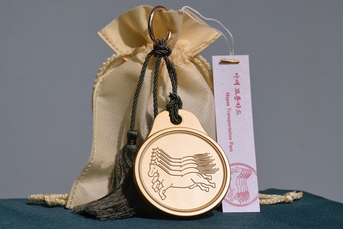 마패 티머니 교통카드는 조선 시대 암행어사가 마패를 보여주고 말을 빌려 타던 모습에서 착안한 상품으로, 마패 디자인을 모티브로 말 일러스트를 새겨넣은 모습이다.