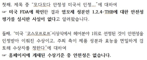 식약처는 또 "코스모프로프 누리집에 게재된 수상기준 중 안전성은 없다"며 "대회 판정단은 유통업자, 브랜드, 전문가 등으로 이뤄져 안전성 평가와 관련된 전문가는 포함되지 않았다"고 지적했다.