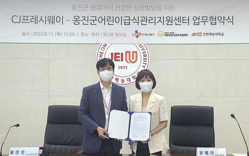 ▲ CJ프레시웨이[051500]는 인천재능대학교가 위탁 운영하는 옹진군 어린이급식관리지원센터와 '어린이의 올바른 식습관 형성과 건강한 성장 발달 지원'을 위한 업무협약을 맺었다고 12일 밝혔다. CJ프레시웨이는 지원센터가 관리하는 유치원, 어린이집, 지역아동센터 등 보육시설 16곳을 대상으로 식습관 교육과 영양·위생관리를 지원할 계획이다. (서울=연합뉴스)