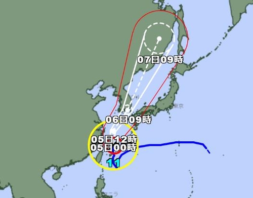 5일 정오까지 24시간 예상강우량은 일본 남부 지역인 규슈 남부에 180㎜, 오키나와와 시코쿠 150㎜, 규슈 북부 120㎜이다.