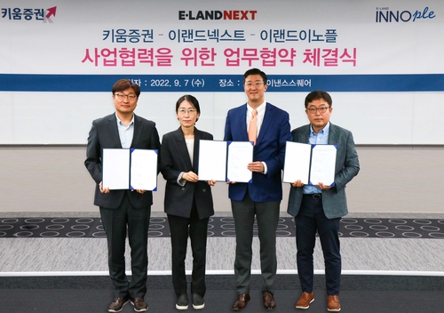 ▲ 키움증권[039490]은 이랜드 그룹 신사업 테크법인인 이랜드넥스트, IT 계열사 이랜드이노플과 업무협약을 체결했다고 7일 밝혔다. 3사는 이랜드넥스트가 준비하는 미술품 분할 소유권 사업에 관련해 전략적 협력을 이어가고 금융과 블록체인을 결합한 협업 과제를 발굴하기로 했다. 또 신규 플랫폼 서비스를 공동 개발하고 미술품 조각투자 서비스 시장을 개척하는데 협력하기로 했다. (서울=연합뉴스)