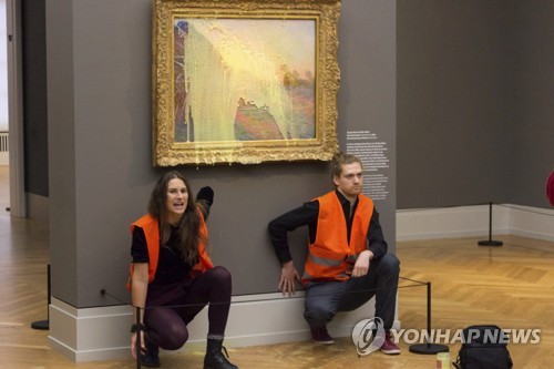 (서울=연합뉴스) 신재우 기자 = 화석연료 사용을 반대하는 독일 기후단체 활동가들이 프랑스 출신의 인상주의 거장 클로드 모네(1840∼1926년)의 작품 '건초더미'에 으깬 감자를 던지는 시위를 벌였다.