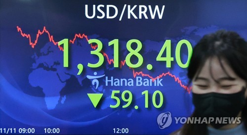13일 외환시장에 따르면 11일 서울 외환시장에서 달러 대비 원화 환율은 59.1원 급락한 1,318.4원에 거래를 마쳤다.
