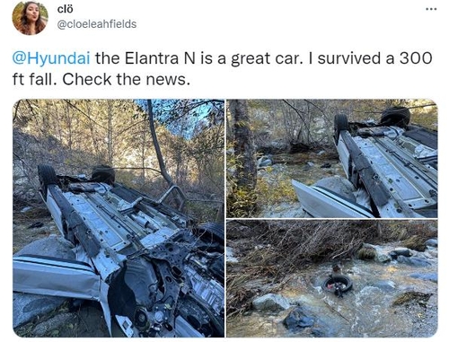 이어 "현대 엘란트라N은 정말 훌륭하다"며 "300피트 아래 떨어져서도 나는 살아남았다"고 전했다.