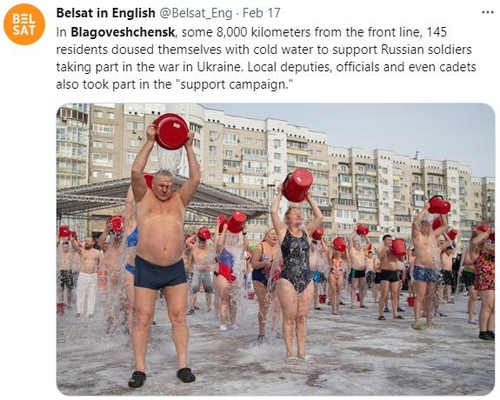 영국 더타임스는 17일(현지시간) 러시아 모스크바에서 4천800마일(약 7천700㎞) 떨어진 블라고베셴스크 광장에 주민 150명 안팎이 집결해 이 같은 행사를 벌였다고 보도했다.