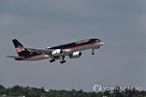 트럼프 전 대통령은 팜비치 공항에서 'TRUMP'라는 큰 글귀가 새겨진 자신의 전용기에 곧장 탑승했다.