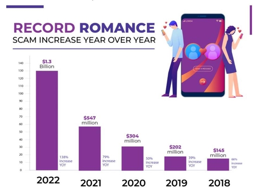 18일(현지시간) 시카고 WGN방송은 인터넷 정보업체 '소셜 캣피쉬'(Social Catfish)의 최신 자료를 인용, 지난해 미국에서 발생한 로맨스 스캠의 피해액 규모가 총 13억 달러(약 1조7천200억 원)에 달한다고 보도했다.