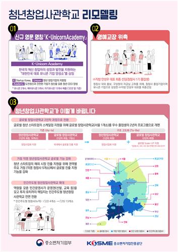 우선 청년 창업자들이 해외에서도 활용할 수 있는 영문 신규 명칭으로 'K-Unicorn Academy'를 발표했다. 또 청년창업사관학교의 유형을 고려해 글로벌 진출 지원 기능 및 성장 지원을 위한 투자유치 프로그램도 강화할 계획이다.