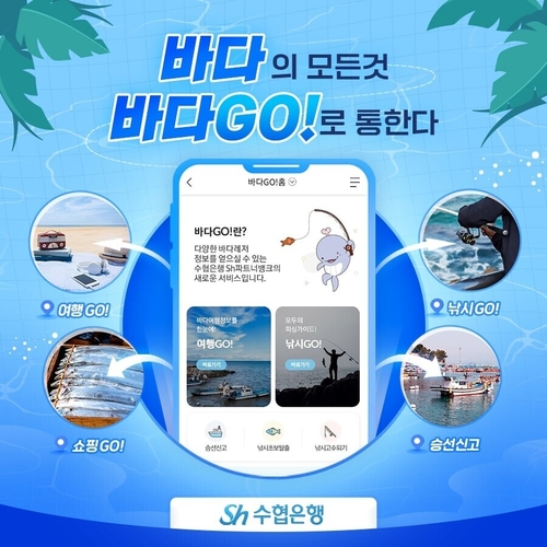 ▲ Sh수협은행은 모바일뱅킹 앱 '파트너뱅크'에 해안 관광, 낚시 정보, 수산물 쇼핑 등 통합 정보를 제공하는 '바다고(GO)' 서비스를 오픈했다고 22일 밝혔다. 바다고는 수협은행이 해양수산부, 한국어촌어항공단, 수산생물 모니터링 플랫폼 애쓰지마와 선보이는 비금융 서비스다. 수협은행은 해수부 '낚시해' 앱과 연계해 낚시 선박 승선 시 작성해야 하는 승선신고서를 바다고로도 처리할 수 있다고 설명했다. (서울=연합뉴스)