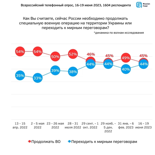 러시아 여론조사기관 '러시안 필드'가 지난달 16∼19일 시민 1천604명을 상대로 실시한 여론조사 결과 응답자의 45%가 "러시아가 특별 군사작전을 지속해야 한다"고 답했다.