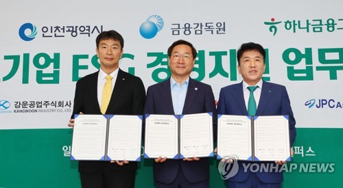 (서울=연합뉴스) 민선희 기자 = 하나금융그룹은 인천광역시, 금융감독원과 협력해 중소기업 ESG(환경·사회적 책무·기업지배구조 개선) 경영을 지원한다고 10일 밝혔다.
