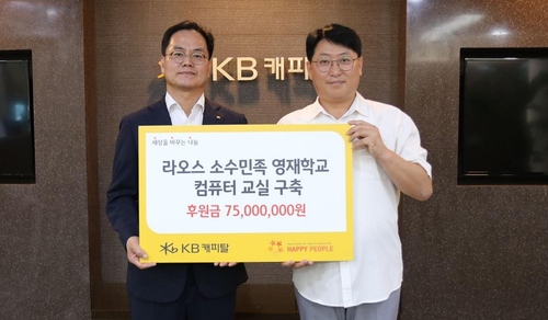 ▲ KB캐피탈은 라오스 소수 민족을 위한 영재학교인 포네사반 중·고등학교에 컴퓨터 교실 구축 및 컴퓨터 교육 강사 양성을 위한 기부금 7천500만원을 사단법인 해피피플에 전달했다고 10일 밝혔다. 지원금은 해당 학교에 컴퓨터 약 30대 및 시청각 장비를 구비한 신규 컴퓨터 교실을 구축하는 데 사용될 예정이다. KB캐피탈은 또 라오스 교육부와 연계해 컴퓨터 교육 강사 양성 및 공식 인증 프로그램을 개설할 계획이다. (서울=연합뉴스)