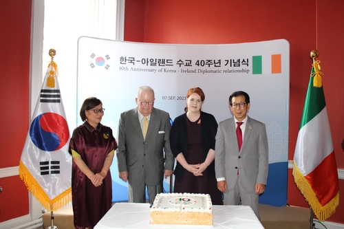 (런던=연합뉴스) 최윤정 특파원 = 주아일랜드 한국 대사관은 외교관계 수립 40주년을 맞아 7일(현지시간) 더블린 벨베데르 하우스에서 아일랜드 정부와 의회 주요 인사, 한국전 참전용사 등 180여명이 참석한 가운데 기념 리셉션을 했다고 8일 밝혔다.