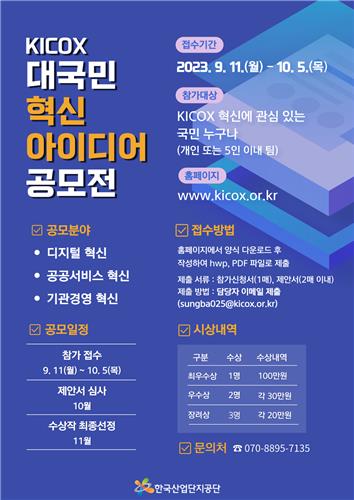 ▲ 한국산업단지공단은 이달 11일부터 10월 5일까지 '대국민 혁신 아이디어 공모전'을 개최한다고 10일 밝혔다. 공모 분야는 산업단지 디지털 혁신, 공공 서비스 혁신, 기관 경영 혁신 3개 분야다. 참여를 원하는 이들은 이메일(sungba025@kicox.or.kr)로 제출하면 된다. 공단은 내부 심사를 거쳐 오는 11월 중 6점의 우수작을 선정해 총 220만원의 상금을 수여한다. (서울=연합뉴스)