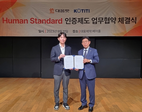(서울=연합뉴스) 김현수 기자 = 반려동물 헬스케어 기업 대웅펫은 국가공인시험기관인 KOTITI시험연구원(코티티)과 반려동물 건강기능식품 품질인증제도 '휴먼 스탠다드'의 출범을 위한 업무협약을 체결했다고 18일 밝혔다.