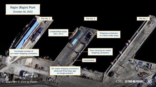 이들 사진에는 9월 7∼8일 나진항 부두에 컨테이너가 쌓인 모습, 같은 달 12일 러시아 선박 앙가라호가 두나이항에 정박한 모습, 10월 1일 컨테이너를 실은 열차가 러시아 티호레츠크의 탄약고에 도착한 모습 등이 담겼다.