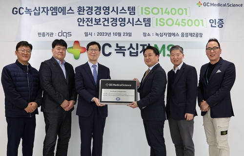 ▲ GC녹십자엠에스가 평가인증기관 DQS코리아로부터 국제표준화기구(ISO)가 제정한 ISO14001(환경경영시스템)과 ISO45001(안전보건경영시스템) 인증을 받았다. GC녹십자엠에스는 "환경 품질, 안전 보건 등 경영 활동에 있어 기업의 투명성과 신뢰성을 확보하고 지속 가능한 경영과 투명한 경영을 추구하며 사회적 책임을 다하는 기업으로 발전하겠다"고 밝혔다. (서울=연합뉴스)