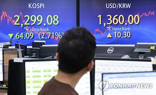 이날 코스피는 전날보다 64.09포인트(2.71%) 하락한 2,299.08로 거래를 마쳤다. 2,300선 아래로 내려선 건 지난 1월 6일(당시 종가 2,289.97) 이후 약 10개월 만이다.