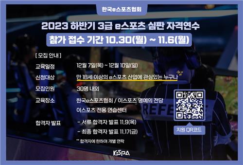 ▲ 한국e스포츠협회(KeSPA)는 2023년도 하반기 3급 e스포츠 심판 자격연수 교육생 모집을 시작한다. 교육은 오는 12월 7일부터 10일까지 4일간 진행되며, 필기와 실기 시험을 통과한 이들에게는 3급 심판 자격이 부여된다. 3급 심판은 협회 주최·주관의 아마추어 및 프로 대회에 출전이 가능하다. 만 18세 이상은 누구나 다음달 6일까지 협회 홈페이지를 통해 지원할 수 있다. (서울=연합뉴스)