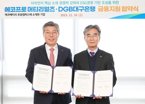 (서울=연합뉴스) 임기창 기자 = 에코프로그룹 소속 5개 계열사가 DGB대구은행과 5천억원 규모의 금융지원 협약을 맺고 안정적 투자 재원을 확보했다.