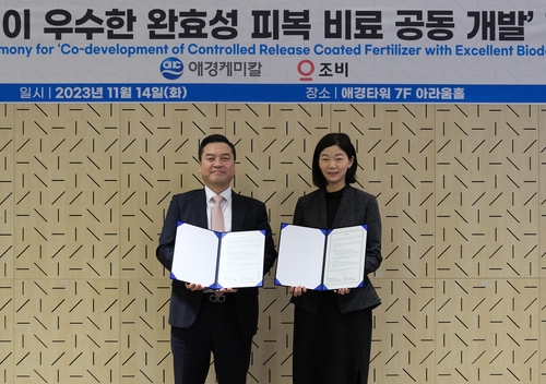 (서울=연합뉴스) 임기창 기자 = 애경케미칼[161000]은 국내 1위 완효성 비료 제조업체 조비와 '생분해성이 우수한 완효성 피복 비료 공동 개발을 위한 업무협약'을 체결했다고 15일 밝혔다.