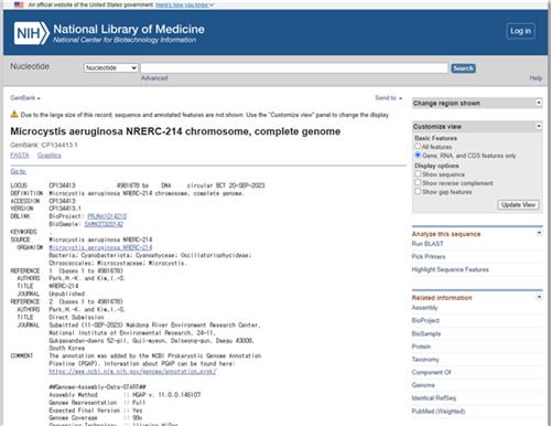 국립환경과학원은 낙동강 유해 남조류 4종 전장 유전체 정보를 미국 국립생물공학정보센터(NCBI)에 등록해 공개했다고 20일 밝혔다.