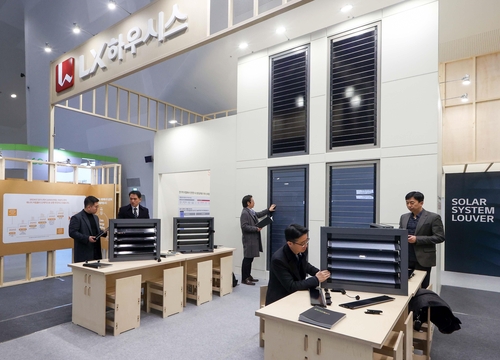 (서울=연합뉴스) 임기창 기자 = LX하우시스[108670]는 28일 서울시 주최로 서울 동대문디자인플라자(DDP)에서 열린 '서울 기후테크 콘퍼런스'에 참가해 공동주택 에어컨 실외기실 루버에 태양광 발전을 결합한 일체형 시스템을 선보였다고 밝혔다.