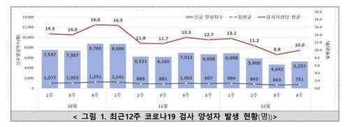전날 질병관리청에 따르면 지난달 4주차(12월 24∼30일) 코로나19 신규 확진자는 5천257명으로, 직전 주 대비 13% 증가했다. 이 기간 일평균 신규 확진자는 751명이다.