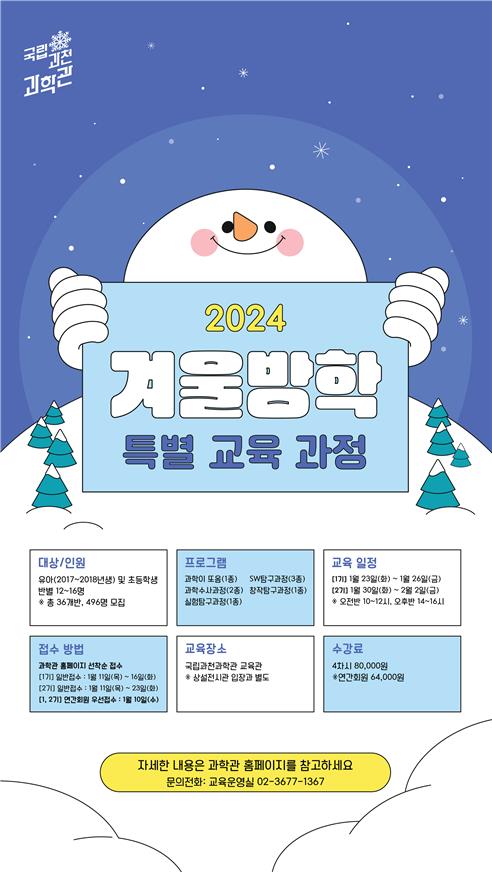 ▲ 국립과천과학관은 겨울방학을 맞아 23일부터 내달 2일까지 평일 특별교육과정을 운영한다. 방송 프로그램을 수업으로 바꾼 '웰컴 투 별별실험실', 학습교재와 실험 재료 등을 집으로 배송해주는 정기구독 서비스 '과학이 또옴' 등이 운영된다. 이외에도 과학 수사, 창작 및 소프트웨어(SW) 수업도 운영된다. 자세한 내용은 과천과학관 홈페이지에 게재돼있다. (서울=연합뉴스)