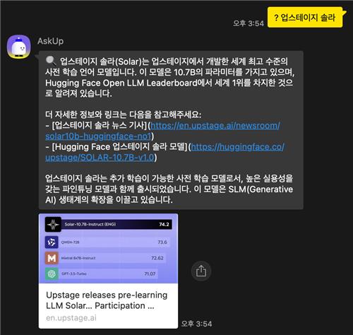 (서울=연합뉴스) 홍국기 기자 = 인공지능(AI) 스타트업 업스테이지는 자체 개발한 거대언어모델(LLM) '솔라'(SOLAR)를 카카오톡 '애스크업'(AskUp·옛 아숙업)에 적용했다고 11일 밝혔다.