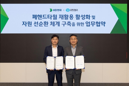 (서울=연합뉴스) 박상돈 기자 = 유한킴벌리는 HD현대[267250]와 최근 핸드타월 수거와 재활용 선순환 체계 구축을 위한 업무협약을 맺고 자원순환과 탄소 저감을 위해 함께 노력하기로 했다고 19일 밝혔다.