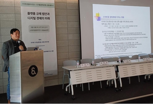 가천대 전성민 교수(전 한국벤처창업학회장)는 31일 서울 강남구 논현동 KTS빌딩에서 스타트업얼라이언스·디지털경제포럼 주최로 열린 '플랫폼 규제 법안과 디지털 경제의 미래' 세미나를 통해 플랫폼법 도입에 따른 수수료 인상과 이로 인한 상품 가격 전이 효과로 소비자 잉여가 최소 1조1천억∼2조2천억원 감소할 수 있다고 추정했다.