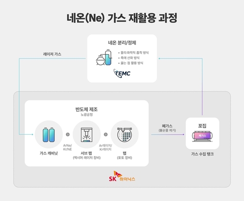 (서울=연합뉴스) 장하나 기자 = SK하이닉스[000660]는 국내 반도체용 특수가스 기업 TEMC와 협업해 반도체 업계 최초로 네온(Ne) 가스 재활용 기술을 개발했다고 1일 밝혔다.