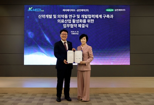 (서울=연합뉴스) 김현수 기자 = 삼진제약[005500]이 케이메디허브(대구경북첨단의료산업진흥재단)와 신약 개발 네트워크 구축을 위한 업무 협약을 체결했다고 17일 밝혔다.