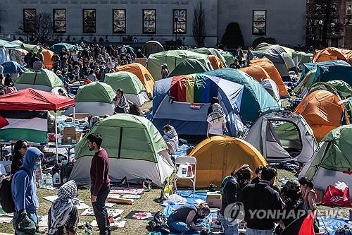이들 학생은 샤피크 총장실 근처 잔디밭에 밤사이 천막 수십개를 설치하고 "이스라엘은 학살을중단하라"고 외치며 사실상 점거 농성에 들어갔다.