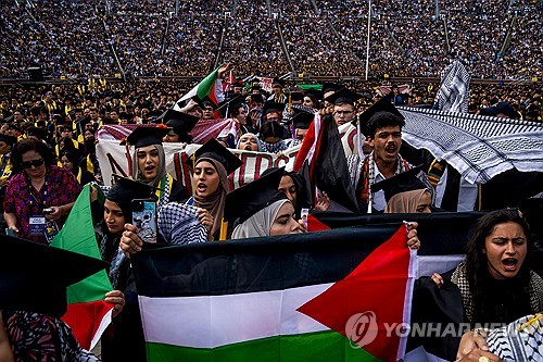 (서울=연합뉴스) 김연숙 기자 = 미국 캠퍼스에서 불붙은 가자전쟁 반전시위가 5월 시작된 졸업식장으로도 번지면서 충돌이 속출하고 있다.