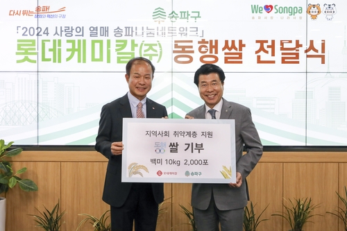 ▲ 롯데케미칼[011170]은 가정의 달을 맞아 10㎏ 쌀 2천포를 서울 송파구청에 기부했다고 8일 밝혔다. 기부된 쌀은 송파구에 거주하는 취약계층과 사회복지관에 전달된다. 이훈기 총괄대표는 "다양한 지원활동을 통해 힘든 상황에 있는 이웃에 대한 책임과 역할을 지속해 확대하겠다"고 말했다. (서울=연합뉴스)