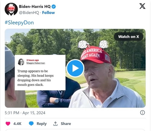 바이든 캠프는 지난달 트럼프 전 대통령이 법정에서 조는 듯한 모습을 보였다는 보도가 나오자 '슬리피 돈'이라는 해시태그를 단 글과 영상을 엑스(X·옛 트위터)에 올렸다.