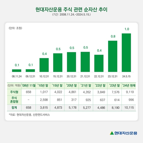 (서울=연합뉴스) 김태균 기자 = 현대자산운용은 주식 관련 순자산이 1조원을 넘겨 설립 이래 최대치를 기록했다고 20일 밝혔다.