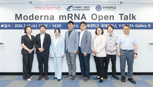 ▲ 모더나가 연세대학교 K-NIBRT 사업단(한국형 바이오공정인력양성센터)과 메신저 리보핵산(mRNA) 기술을 통한 의약품 개발 등에 대해 논의하는 세션을 진행했다. 특별 연사를 맡은 모더나 글로벌 공정 화학 부문 펠로우 과학자 임진수 박사는 mRNA 플랫폼을 바탕으로 여러 질병 치료제를 개발하고 미래 팬데믹에 대비하고 있다고 말했다. (서울=연합뉴스)