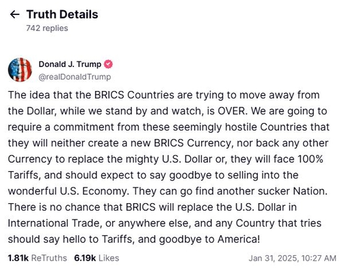그러나 트럼프 대통령은 이날 "국제교역뿐 아니라 어떤 분야에서든 브릭스가 달러화를 대체할 가능성은 없다"고 단언했다.