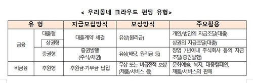 우리동네 크라우드펀딩의 유형은 자금모집 및 보상방식에 따라 대출형, 증권형, 후원형으로 구분된다.