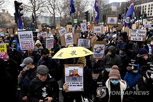 (런던=연합뉴스) 김지연 특파원 = 영국 런던에서 8일(현지시간) 중국이 추진 중인 주영국 대사관 신축에 반대하는 시위가 벌어졌다.
