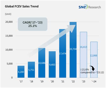 SNE리서치는 "국내 시장의 저조한 판매량이 글로벌 시장 위축의 주요 요인으로 작용하고 있다"면서 "정부는 상용차 중심으로 보급 확대 전략을 조정하고 있지만 충전 인프라 부족, 수소 생산·저장 비용 문제, 경제성 확보의 어려움이 여전히 과제로 남아 있다"고 분석했다.