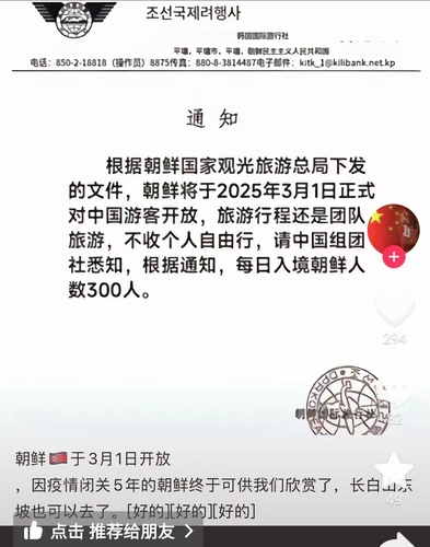 기본 서식은 북한 공문 형태를 띠지만 본문은 중국어로 편집된 것으로 보이는 이 통지문은 "조선(북한) 국가관광여유총국(국가관광총국)이 하달한 문건에 근거해 조선은 2025년 3월 1일 중국 여행객에게 정식으로 개방한다"는 내용을 담고 있다.