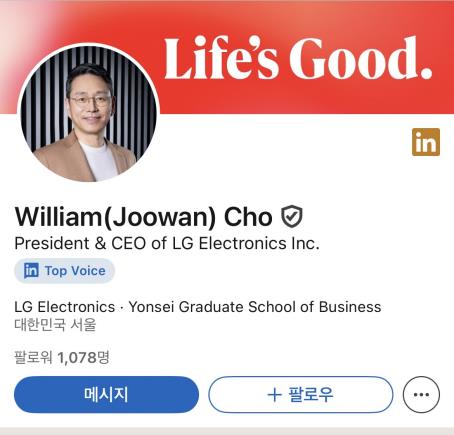 16일 재계에 따르면 조 CEO의 링크트인 계정은 지난 14일 '톱 보이스' 인증 배지를 획득했다.