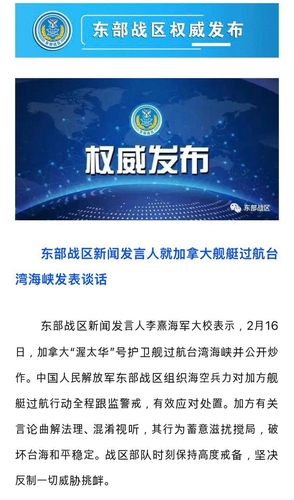 중국인민해방군에서 대만해협과 동중국해·태평양을 담당하는 동부전구는 "우리는 해·공군 병력을 조직해 캐나다 군함의 항행 전 과정을 감시하고 효과적으로 대응했다"면서 "동부전구 부대는 항상 높은 경계 태세를 유지하며 모든 위협과 도발에 단호하게 맞설 것"이라고 덧붙였다.