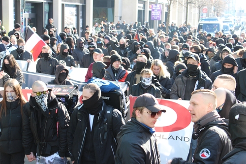네오나치들은 독일 헤비메탈 밴드 람슈타인의 '도이칠란트'를 틀어놓고 후렴구 '독일, 무엇보다 독일'을 따라 부르다가 '동독! 동독!'을 외치며 행진했다. 손에는 삼색 독일연방공화국 국기와 옛 독일제국 국기가 들려 있었다. 이들은 창문 밖으로 야유를 보내는 주민들을 향해 연신 가운뎃손가락을 치켜들었다.