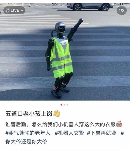 24일 신징바오 등 중국 현지 매체들에 따르면 지난 22일 베이징시 하이뎬취 우다커우에서 교통 경찰관의 모습을 흉내 낸 휴머노이드 로봇이 목격됐다.