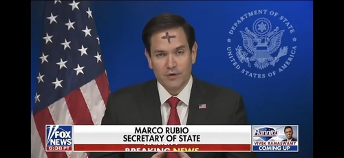 (서울=연합뉴스) 황철환 기자 = 마코 루비오 미국 국무장관이 이마에 재로 십자가를 그린 채 방송에 출연한 것과 관련해 논란이 이어지고 있다.